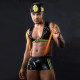 Костюм сшит из блестящей «мокрой» ткани. Топ с низким вырезом практически не закрывает торс. Грубая застежка спереди и широкая резинка в яркую салатовую полоску добавляют образу жесткости и мужественности. Шорты-трусы на широкой резинке идеально садятся на ягодицы и интригующе очерчивают все интимные места партнера. Ярко-оранжевые подтяжки контрастными полосами ложатся на части костюма и тело, неизменно привлекая внимание. Круглая каска с полями очень гармонично завершает стильный образ.