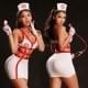 Маленькое платье пошито из белой эластичной ткани, которая плотно садится на тело, выгодно подчеркивая все аппетитные формы. Белые топ и мини-юбка скреплены между собой перекрещенными красными полосами, оставляя оголенными красивый живот и спинку. Этими же красными лентами оторочены чашки топа. Красные крестики на груди напоминают, что перед нами медсестра, готовая приступить к пикантным процедурам. Сетчатые перчатки, конечно, служат символом чистоты, симпатичный чепчик и стетоскоп завершают игривый образ.