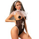 Костюм представляет собой любопытное сочетание. Сетчатое боди с большим крестом посередине и открытой грудью смотрится потрясающе. Некрупная сетка красиво облегает фигуру, очерчивая все изгибы. Проходящий между грудью мягкий стреп имеет расширение для того, чтобы продеть в него голову. Таким образом боди фиксируется на шее. Высокая посадка боди обнажает ягодицы, спинка также остается открытой. Оголенные соски можно прикрыть пэстис в виде крестов, которые есть в комплекте. Широкий чокер с длинным волнистым фатиновым воланом также служит небольшой маскировкой для груди. Пышная вуаль крепится к волосам и дополняет необычный образ. Костюм выполнен в контрастных бело-черных цветах, что лишний раз указывает, что перед нами — хоть и жаждущая любви, но все же монашка.