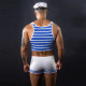 Костюм моряка сшит из бело-голубого материала. Голубой топ в белую полоску на широких лямках выглядит потрясающе за счет двух пуговиц, на которые можно прицепить лямки по примеру комбинезона. Регулировать длину топа можно широкими ползунками. Короткие белые шорты с двумя полосами по низу и четырьмя пуговицами спереди смотрятся очень стильно и будоражаще: мягкий материал обтягивает аппетитную попку и нежные места, привлекая взгляд. Белая кепка с черным козырьком дополняет образ.