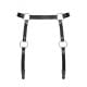 Гартеры выполнены из мягкой искусственной кожи и широких резинок. Детали небольшого размера скреплены между собой заклепками и большими металлическими кольцами, что создает настроение страсти и легкой агрессии. Резинка на поясе и грубые застежки с пряжкой и ремнем на спинке регулируются. Есть крепкие держатели на концах резинок.