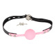 Яркий кляп в виде небольшого шарика розового цвета с черным ремешком. Имеет регулируемую застежку на ремешке с металлической пряжкой и навесной замочек. Выполнен из качественного гипоаллергенного силикона. Диаметр - 4 см.