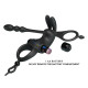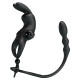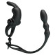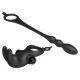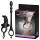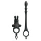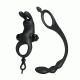 Двойное эрекционное кольцо черного цвета. Сделано из мягкого и эластичного силикона. Игрушка оснащена виброэлементом в виде кролика с ушками для стимуляции партнерши и анальной пробкой, которая соединена с кольцом для мошонки при помощи длинной сцепки.