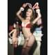 Костюм выполнен в традиционных красно-белых цветах зимних праздников. Бархатистая текстура материала и имитация меховой опушки выглядит очень нарядно, при этом ткань приятно ощущается на теле. Наряд состоит из трусиков, бюстгальтера и обруча с ушками, также предусмотрены дополнительные аксессуары — милый “меховой” чокер с бантиком, перчатки и чулки. Сзади на трусиках предусмотрен маленький “хвостик” для завершения образа девочки-кролика. Бюстгальтер на завязках, что позволяет немного регулировать объем и рост.