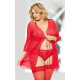 Пеньюар с рукавом 3/4 выполнен в красном цвете из легкой, полупрозрачной мелкой сетки. Изделие свободного кроя и струящейся формы, завязывается спереди атласной черной ленточкой. В комплекте к пеньюару идут трусики. Подойдет для пышных красавиц.