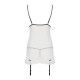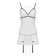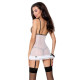 Нежное кружево, игривые воланы, белый цвет – все это выглядело бы исключительно невинно, если бы не черная портупея на груди, которая сразу делает образ сексуальным и возбуждающе увлекательным. Бретели регулируются по высоте для идеальной посадки, а на рубашке есть регулируемые подвязки для крепления чулок, так что вы сможете добавить в наряд свою изюминку. В комплекте – миниатюрные стринги.