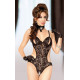 Відверте боді на тонких бретелях, виконане в чорному кольорі з еластичного мережива в троянди. Модель має невеликі вирізи в області грудей та паху, бюстгальтер декорований ошатним бантиком. Відкрита спина та вирізи з боків роблять фігуру більш витонченою.