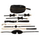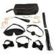 Високоякісний бондажний комплект із 7 предметів + сумка від Bad Kitty у стильному шкіряному виконанні з металевими елементами золотистого кольору. У комплект входять 1 пов'язка на очі, 1 кляп, 1 пара наручників з 1 з'єднувальним ланцюжком (карабін), 1 нашийник, 1 повідець, 1 флогер.
