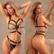 Топ-портупею зроблено у такий спосіб, щоб було зручно регулювати під особливості фігури. Спереду стрепи гарно окреслюють груди, залишаючи їх оголеними. Заклепки та кільця ніби натякають, що до стрепів можна прикріпити повідець або інші аксесуари. Низький пояс-гартер також прикрашений кільцями, до яких кріпляться каскадом численні ланцюжки. Вони прикривають трусики, одночасно привертаючи увагу до інтимних містечок.