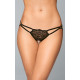 Красиві трусики в чорному кольорі з м'якого мережива. Прикрашені зверху та на сідницях тканинними смужками. Інтимна зона пікантно відкрита.