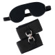 Сет включає пару м'яких тканинних наручників, скріплених поворотним металевим замком із застібкою на липучці, а також зручну глуху напівмаску з еластичним ремінцем.
