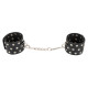Широкі шкіряні наручники з'єднані між собою металевим ланцюжком. Аксесуар виконаний у чорному кольорі, декорований металевими заклепками. Чудовий аксесуар для БДСМ-ігор.